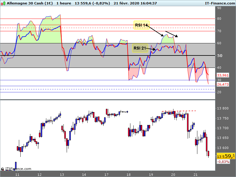 A proximité d’une importante zone de résistance (chiffre rond 13800), présence d’une divergence de l’indicateur avec risque de correction…